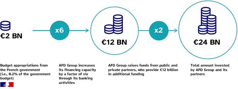 AFD has significant leverage as an efficient and cost-effective public bank. It is able to turn €2 billion in government budget appropriations into a financing capacity of €12 and €13 billion each year. An additional €12 billion is provided through public and private co-financing, bringing the annual total to almost €25 billion. In other words, for every €1 invested by the French government, nearly €12 goes to addressing global priorities such as combating climate change, preserving biodiversity, and supporting public health, education, and food security.