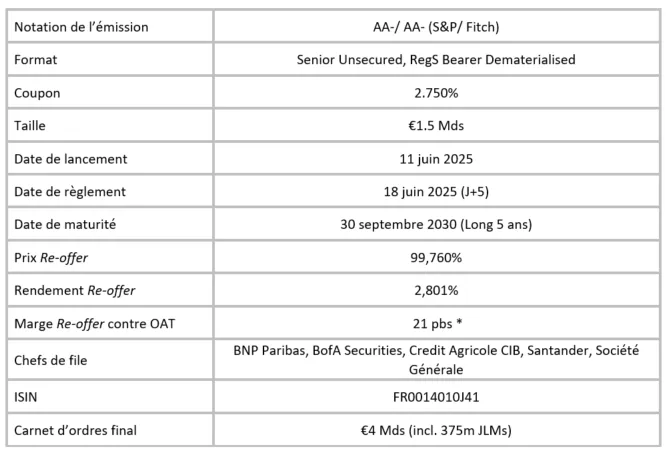 - The new €1.5 billion Long 5-year bond offers a yield of 2.801%, equivalent to a spread of 21bps over the interpolated French curve (OAT 2.50% 05/25/30 & OAT 0.00% 11/25/30).