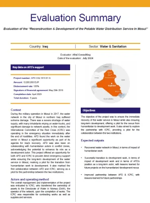 The objective of the project was to ensure the immediate recovery of the water service in Mosul while also ensuring long-term development, offering a pilot for the nexus from humanitarian to developme...