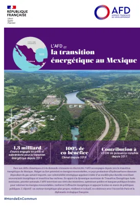 L’appui de cette transition est un axe fort de l’action de l’AFD qui a établi, depuis 2011, un partenariat privilégié avec la Commission fédérale d’électricité (CFE). Quatre financements successifs lui ont été accordés, visant à améliorer l’efficacité énergétique et à augmenter l’usage des énergies renouvelables, en particulier à travers la modernisation du parc de centrales hydroélectriques.