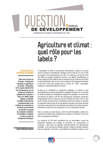 Cette note est issue de l'ouvrage « Changement climatique et agricultures du monde » (Torquebiau, 2015), travail collectif d’état des connaissances sur ces thèmes de recherche et opérationnels communs à l’AFD et au CIRAD. Gaëlle Balineau et Sylvaine Lemeilleur présentent les questionnements et les résultats de la recherche en économie qui permettent de discuter la capacité des standards volontaires de durabilité à contribuer à relever les défis du changement climatique.