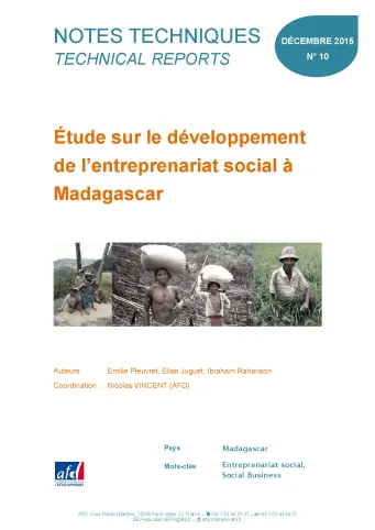 Cette étude vise à caractériser le développement de l’entreprenariat social (ou social business) à Madagascar, à partir d‘une définition relativement large et basée sur la nature et les perspectives du projet. Près de 90 projets ont pu être recensés, qui présentent une grande diversité en termes de missions sociales, de secteurs, de statuts, d‘histoire. L’étude plus approfondie de 10 projets permet de faire ressortir la richesse et l’inventivité des entrepreneurs sociaux à Madagascar, ainsi que les difficultés rencontrées pour concilier mission sociale et équilibre financier, certains facteurs clefs de succès et les besoins d‘accompagnement technique et financier de ces nouveaux modèles d‘entreprise.