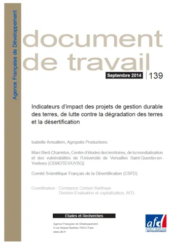 Le présent document se situe dans la problématique de la recherche de bons indicateurs pour l’évaluation des impacts à long terme des actions de développement. Le champ de l’étude concerne ici les actions de gestion durable des terres, de restauration et de réhabilitation des milieux dégradés, de prévention de la dégradation des terres, de lutte contre la désertification, plus particulièrement dans les régions sèches, arides, semi-arides et subhumides.