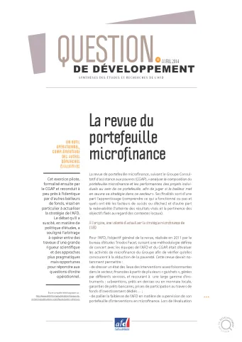 Cet exercice pilote, formalisé ensuite par le CGAP et reconduit à peu près à l’identique par d’autres bailleurs de fonds, visait en particulier à actualiser la stratégie de l’AFD.