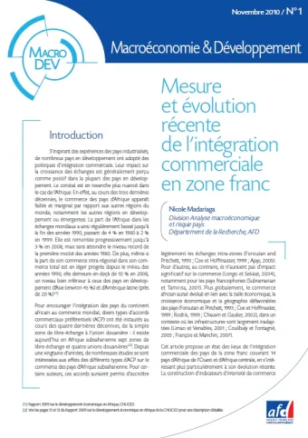 S‘inspirant des expériences des pays industrialisés, de nombreux pays en développement ont adopté des politiques d‘intégration commerciale. Leur impact sur la croissance des échanges est généralement perçu comme positif dans la plupart des pays en développement. Le constat est en revanche plus nuancé dans le cas de l’Afrique : baisse de la part du continent dans les échanges mondiaux, faiblesse de la part de son commerce intrarégional dans son commerce total, contexte économique défavorable, infrastructures inadaptées, etc. Pour étudier cette question, cet article propose un état des lieux de l’intégration commerciale des pays de la zone franc couvrant quatorze pays d‘Afrique de l’Ouest et d‘Afrique centrale, en s‘intéressant plus particulièrement à son évolution récente.