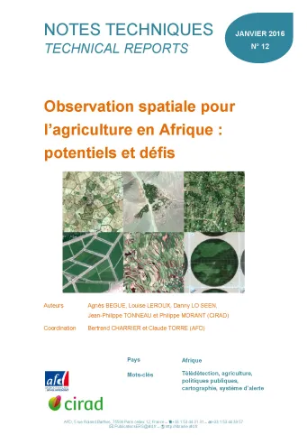 Ce rapport a pour objectif de faire un état des lieux des usages des technologies satellitaires dans le développement et l’analyse des agricultures africaines, afin de mieux cerner les difficultés actuelles, identifier les contraintes sur lesquelles la recherche et le partenariat peuvent avoir un effet, et imaginer les actions nécessaires pour lever ces contraintes à court et moyen termes. L’ensemble du continent africain est traité, avec un focus sur l’Afrique de l’Ouest. L’échelle abordée est l’échelle nationale à laquelle se mettent en place les politiques publiques agricoles.