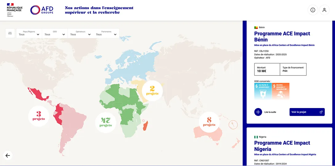 Des projets concrets illustrent cette action : au Kenya, la création du Complexe en sciences et ingénierie de l’Université de Nairobi ; en Colombie, une offre de prêt étudiant ciblant les populations vulnérables ; et à travers le programme PeA (Partenariats Académiques Afrique-France), la mise en œuvre de filières professionnalisantes dans 50 universités africaines et françaises.